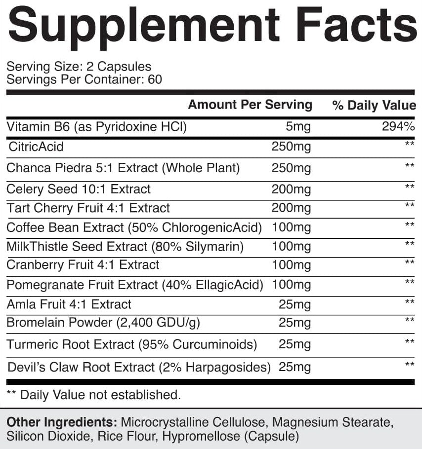 - Featuring Turmeric, Tart Cherry, Green Coffee Extract, Celery Seed, Chanca Piedra, Quercetin, Bromelain, Vitamin B6 & Citric Acid, these potent ingredients work together to support immune balance, healthy circulation, and kidney detox & health.